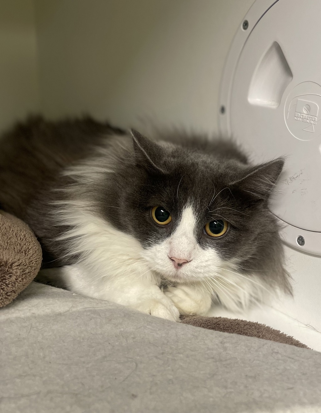 Bluebell is an 8-month-old grey and white long-haired beauty with a heart full of love and a motor that never stops purring. She's incredibly sweet, playful, and always ready for a snuggle. Bluebell adores attention and will happily curl up in your arms or by your side. Her silky fur and gentle nature make her the perfect companion. Bluebell is ready to bring joy and warmth to her forever home-could it be yours?