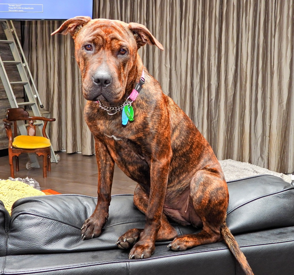 She’s been fostered before with a male Staffy mix and was a respectful, if occasionally enthusiastic, little sister. She reads other dogs well and knows when to back off—though she may need the occasional reminder to give her housemate a break! She’s also been around kids of all ages and is gentle, but can sometimes still be jumpy.