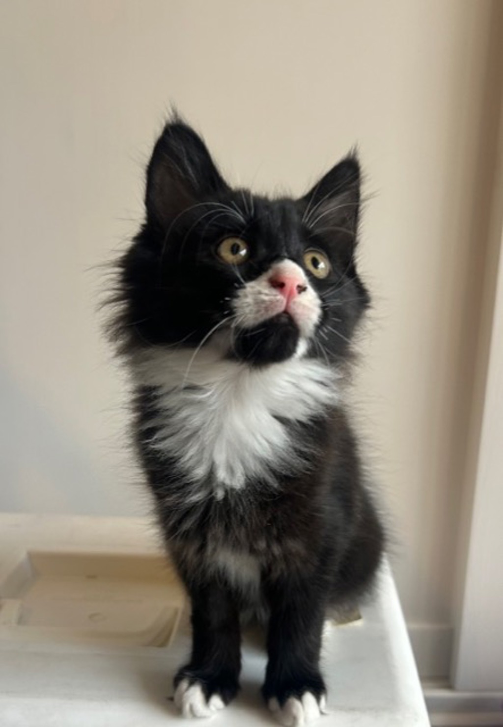 Our tuxedo kitten loves to cuddle and falling asleep on your lap. He is happy alone and with other cats. Moe will make a lovely companion for his lucky forever family