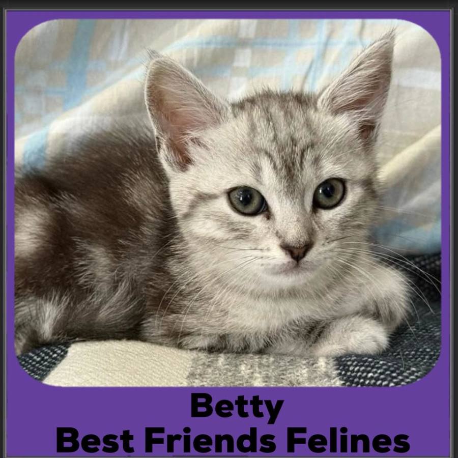Betty is a bold little cuddlebug with a heart full of love and a playful sparkle in her eye. She dives into life with fearless curiosity—climbing, pouncing, and exploring every corner with confidence and charm. But as much as she loves a good adventure, her favorite place is still nestled close to her humans, where she can snuggle in and purr contentedly. Affectionate and delightfully clingy, Betty has a way of appearing by your side the moment you sit down, curling up like she’s always belonged there. Sweet, sassy, and full of love, Betty makes every moment feel warmer.