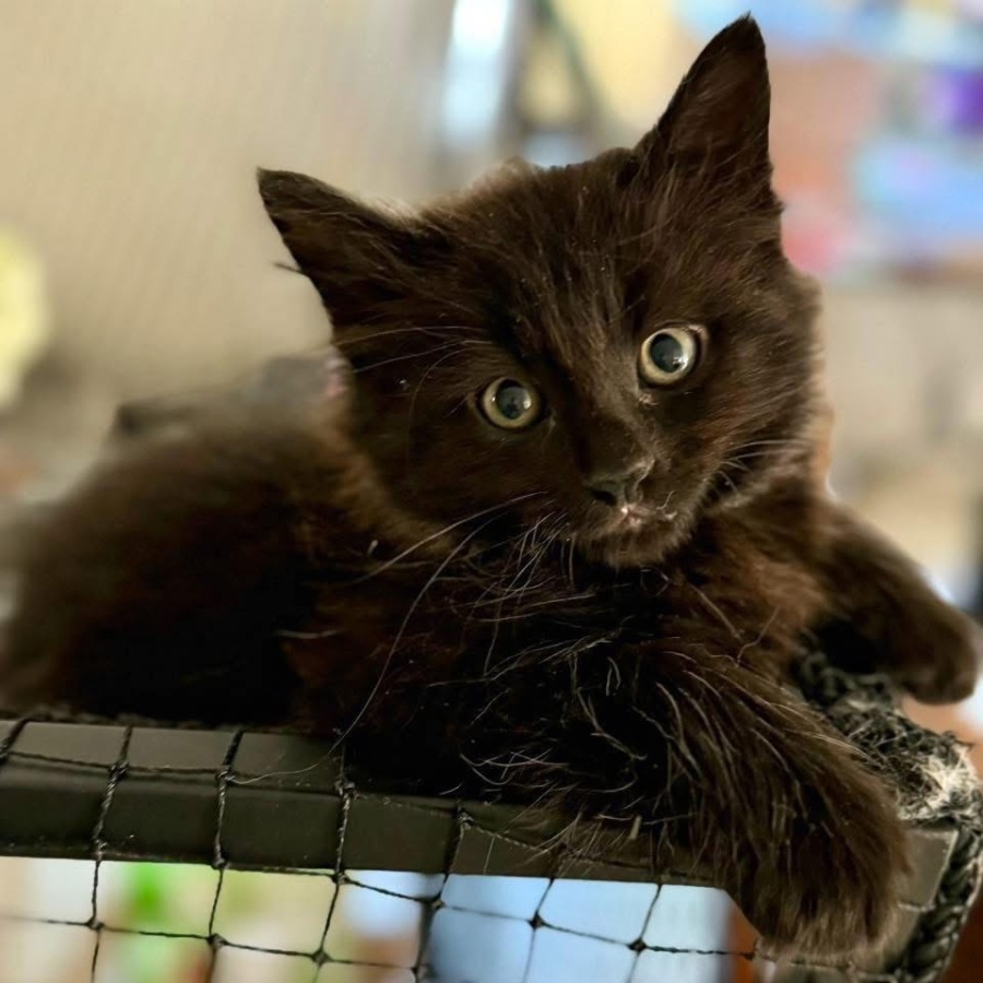I am the perfect mix of extra floof and stylish long black fur. I am a kitten who enjoys playing, exploring and napping.