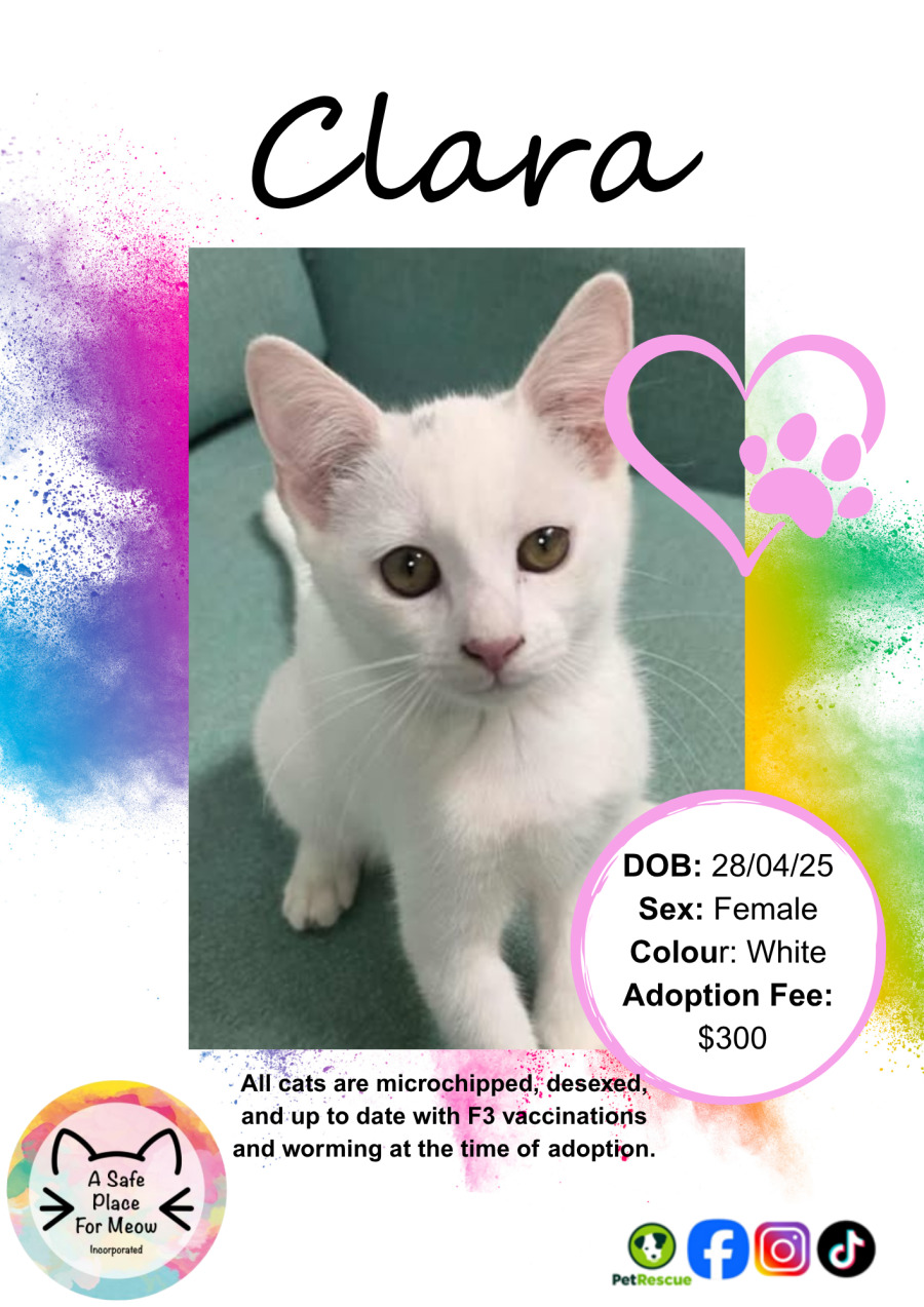 Clara has recently recovered from cat flu. While she’s now healthy and happy, this is something to keep in mind as flare-ups can occasionally occur in times of stress.