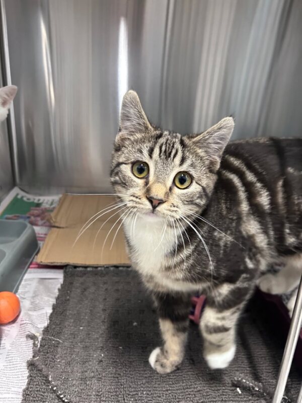 Hi there, my name's Gru! I'm a 3-month-old male Domestic Short Hair kitten with a medium energy level. I'm still a tiny little guy, but I'm full of love and curiosity. I love exploring new places and I'm always ready for a good play session. Despite my youthful energy, I also enjoy the quieter moments in life. There's nothing better than curling up for a good nap after a busy day of play. I assure you, I make an excellent cuddle buddy! I haven't had much experience with children yet, but I don't have any known issues with them. I'm a friendly little guy who's ready to meet all kinds of new friends. I'm just a young kitten looking for a forever home where I can grow and thrive. I can't wait to meet my new family and start making memories together. Could that be with you?