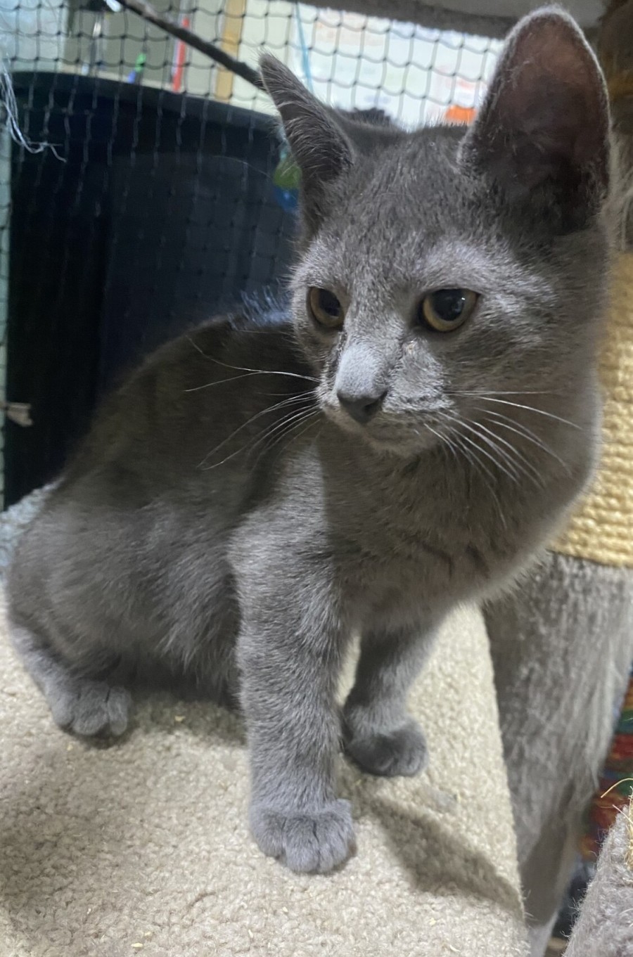 This handsome little lad came to us with his older siblings and hasn't stopped playing with them or anyone else since. He's all about the action - wrestling, zooming, pouncing - especially if there's another kitten involved. He's social, curious, and always ready to start a play session.