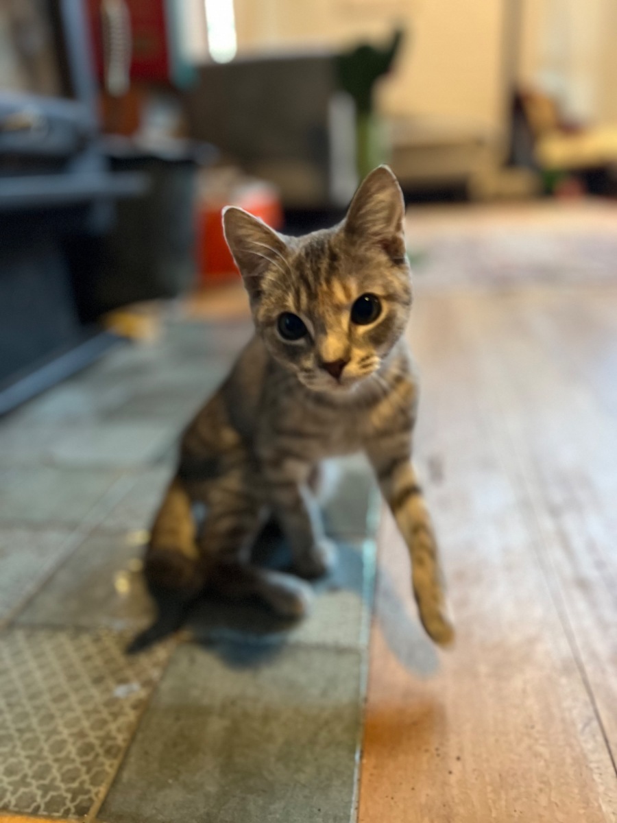 Nori arrived in care with some serious injuries and very underweight. We were unsure of her future but she was determined to survive and not only survive, to thrive. She marched into the house on day one and decided to be best friends with the resident Great Dane. As a tiny, very sick, kitten that was a hugely brave act and she just demands to be friends with everyone and everything ever since.