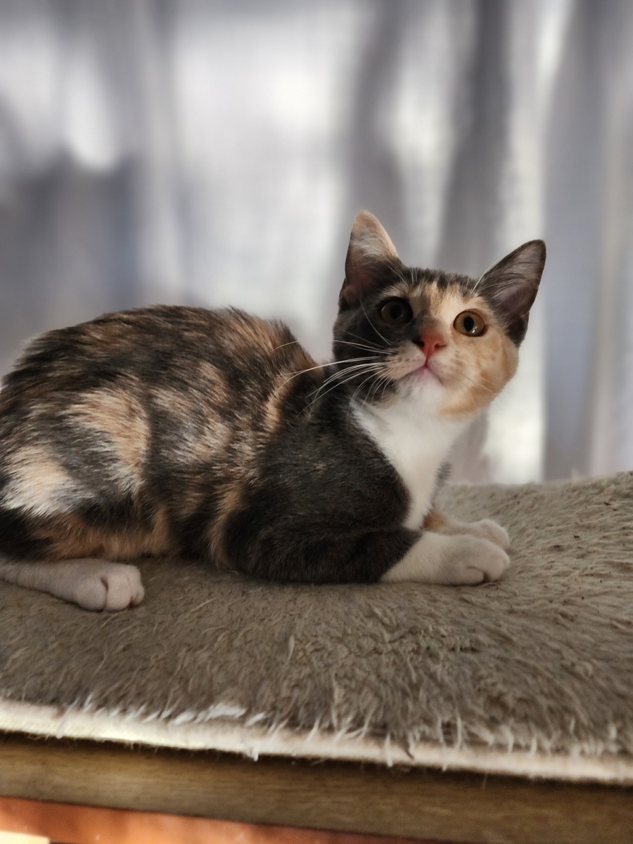 Calypso – Calypso is a sweet calico domestic short-haired kitten has charm and playfulness. She is curious and bold, always eager to explore new nooks and play with interactive toys. Calypso also loves climbing and jumping, demonstrating the spirited energy typical of kittens her age. She is completely litter-trained (using Breeders Choice litter) and eats the same nutritious diet of Wellness CORE kitten turkey & chicken liver pâté and Royal Canin kitten dry food.