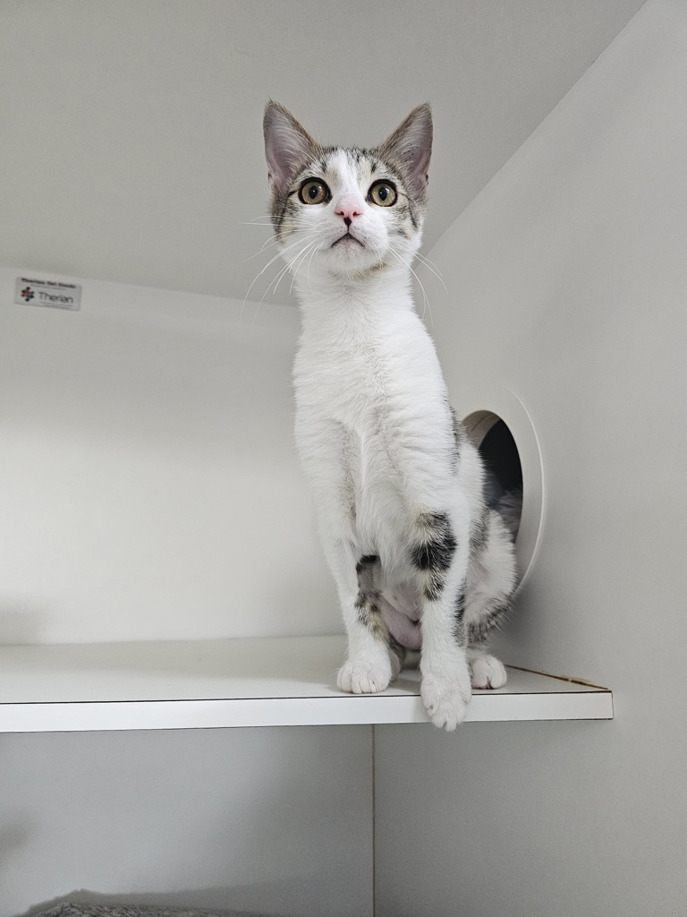 Hey there, I'm Tanner. I'm a friendly and affectionate kitten who would suit most homes! My playful paws are always ready to pounce on anything that moves. I love playing with wand toys and mysterious shadows on the wall! When I'm finished playing, I love nothing more than finding a warm lap to curl up in. I have perfected the art of the irresistible purr. It's like my secret weapon for getting all the cuddles and chin scratches I could ever want. Life's just one big, exciting string of moments, and I'm here to make every second count - whether I'm chasing my tail or sharing some purr-fectly quiet time with my favourite humans. So, if you're up for a bundle of furry fun and a lifetime of companionship, please consider adopting me!