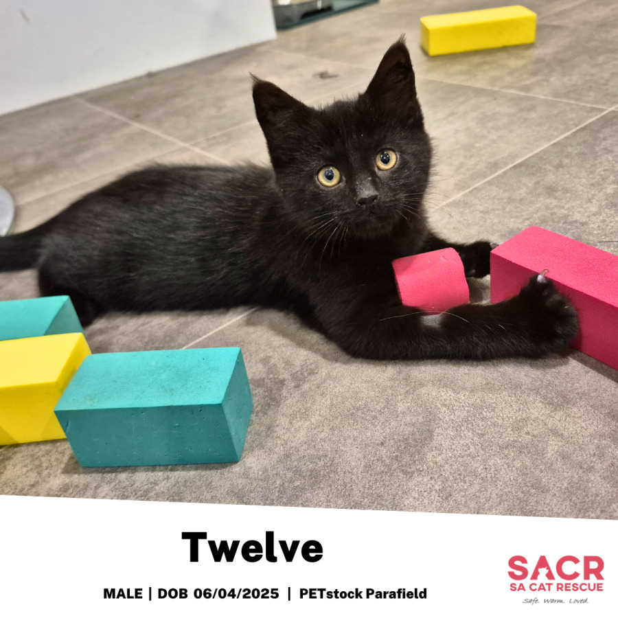 Twelve is a black kitten with the softest fur and the sweetest heart – and yes, he’s a bit of a quirky little guy. With a slight head wobble and eyes that don’t always seem quite focused, he might look a little different at first glance – but his vet has given him the all-clear. That’s just Twelve being uniquely Twelve!