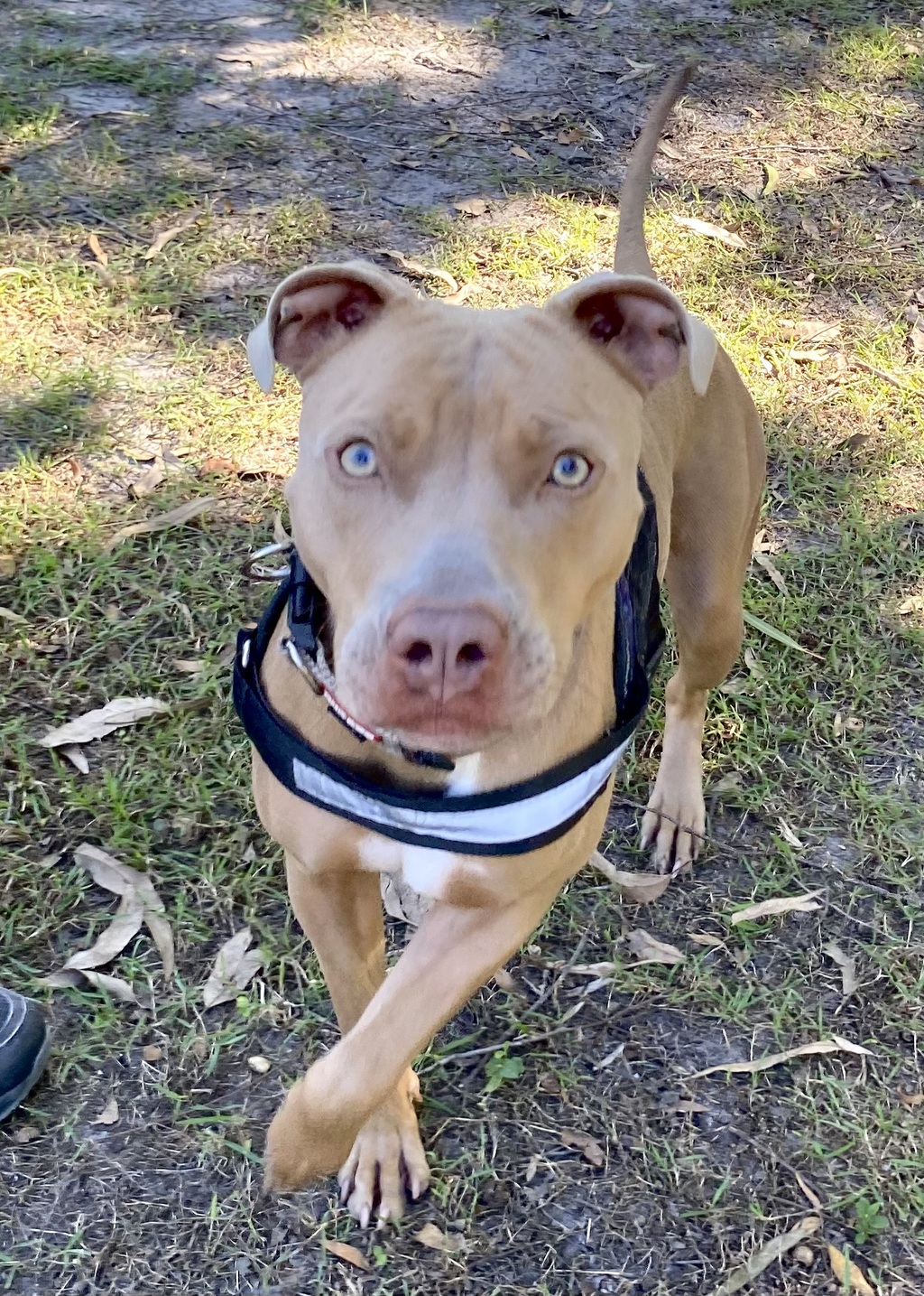 An adorable 18-month-old American Staffy mix with a beautiful fawn coat.