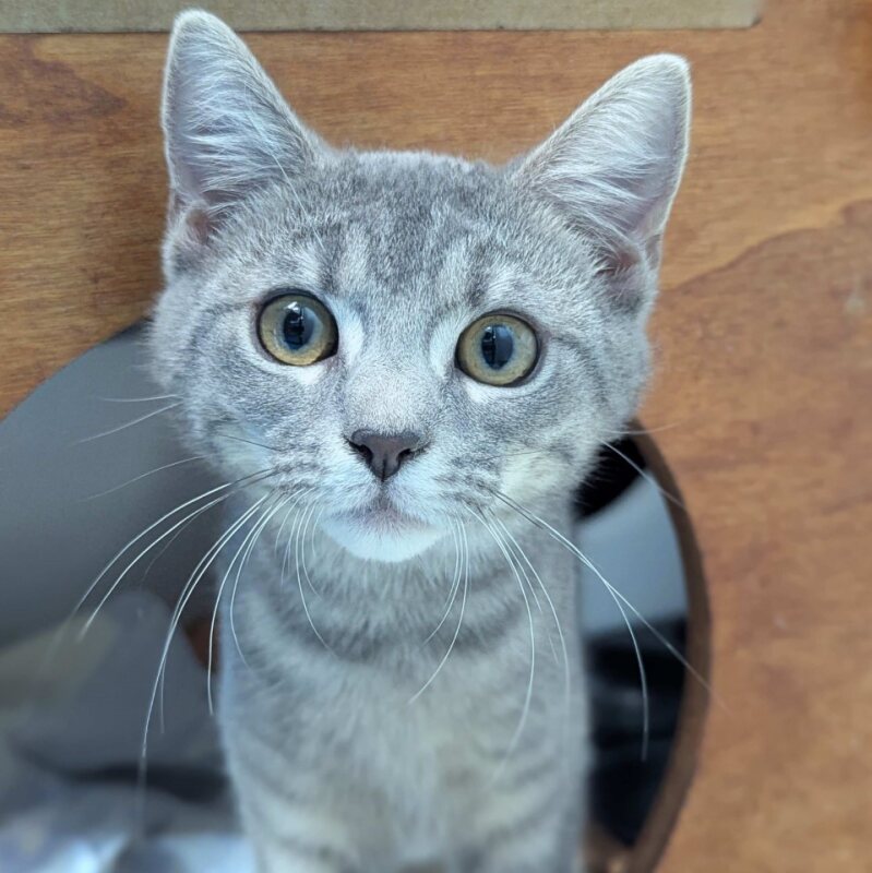 I’m a silver tabby with soft, shimmery fur and big, curious eyes. At first glance, I might seem a little unsure — that’s because I take my time getting to know new people and places. But give me a bit of patience, and I promise I’ll become the sweetest, snuggliest kitten you've ever met.