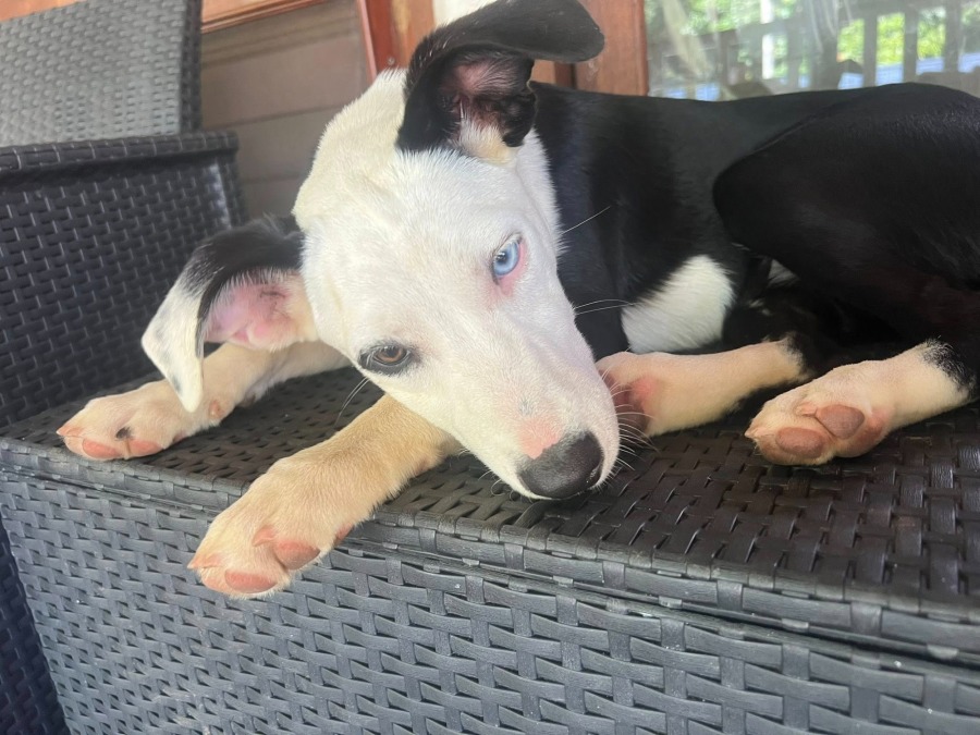 With one blue eye full of mischief and one brown eye full of heart, Princess is a stunning little whirlwind of energy and affection. She’s happiest when she’s running full speed across the yard or bouncing between toys in a joyful blur.