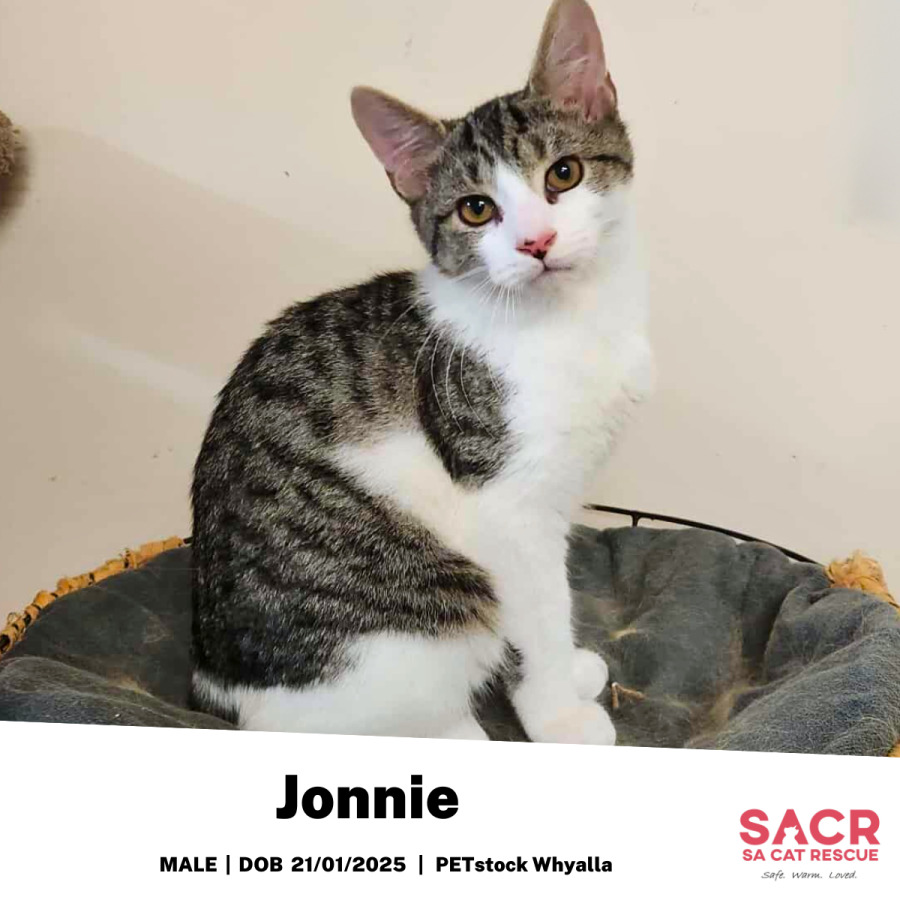 Jonnie's adoption fee is $195 which includes desexing, microchipping, parasite prevention, and initial F3 vaccination.