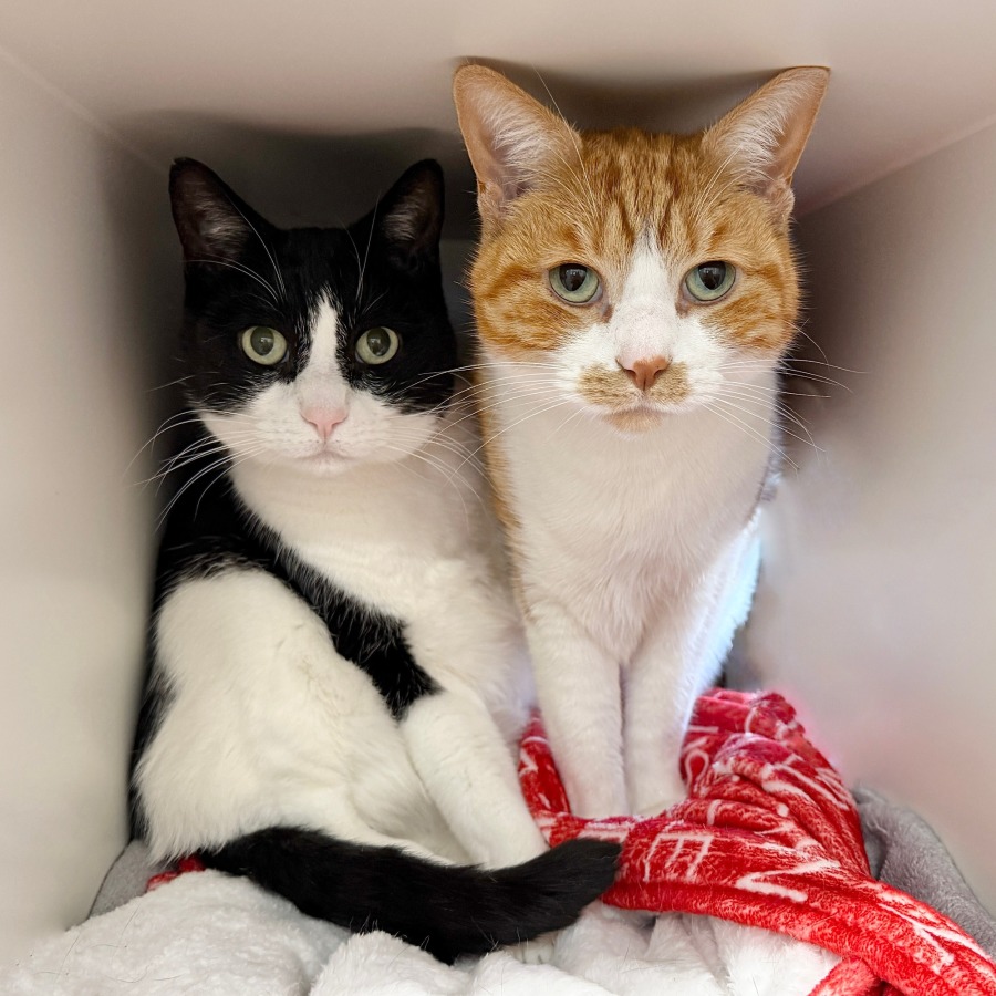 Harold, with his striking black and white coat and Kumar has a soft ginger and white coat and a calm, thoughtful personality. He enjoys the simple things in life like a sunny window, a cozy blanket, and quiet company. Together, they create a perfect balance of calm and companionship.