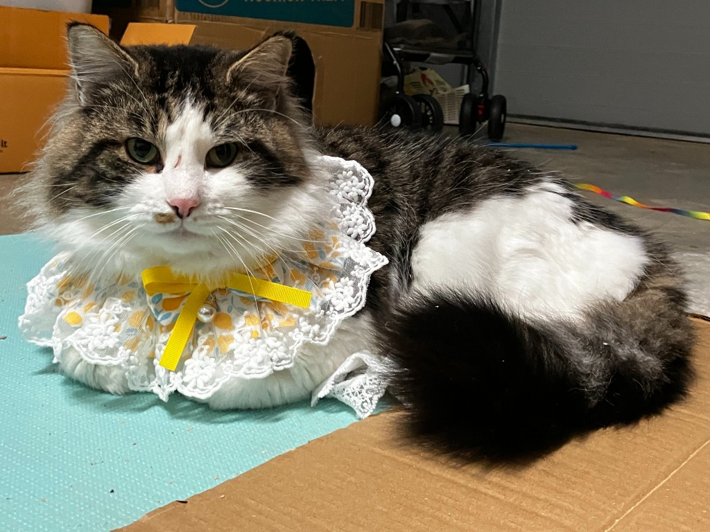 Johnny is a strikingly handsome, bushy-tailed boy with a distinctive grey mask and cape over a soft white coat. He has a broad build, expressive eyes, and an intelligent gaze. He’s curious, chatty, and playful, especially fond of rope toys and scratchers. No matter how comfortable he is in a nap, if his person enters the room, Johnny will always get up to greet them with enthusiasm. He’s alert, intuitive, and street-smart—and not afraid to let the vacuum know who's boss (although he’s still learning to coexist with it!).