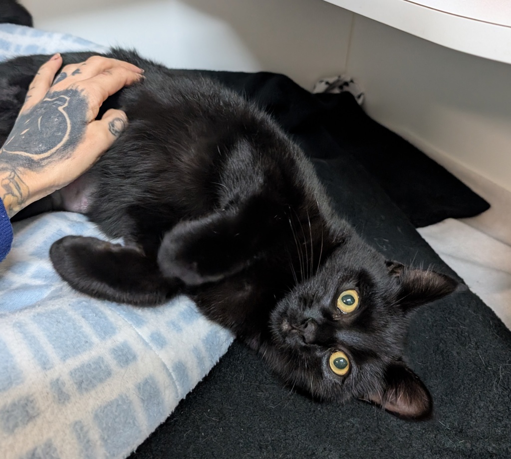 Witty is a gorgeous 5-month-old black kitten with a personality as charming as her name! This little lovebug is playful, curious, and adores belly rubs - she'll flop over and show off her tummy the moment she feels at home.