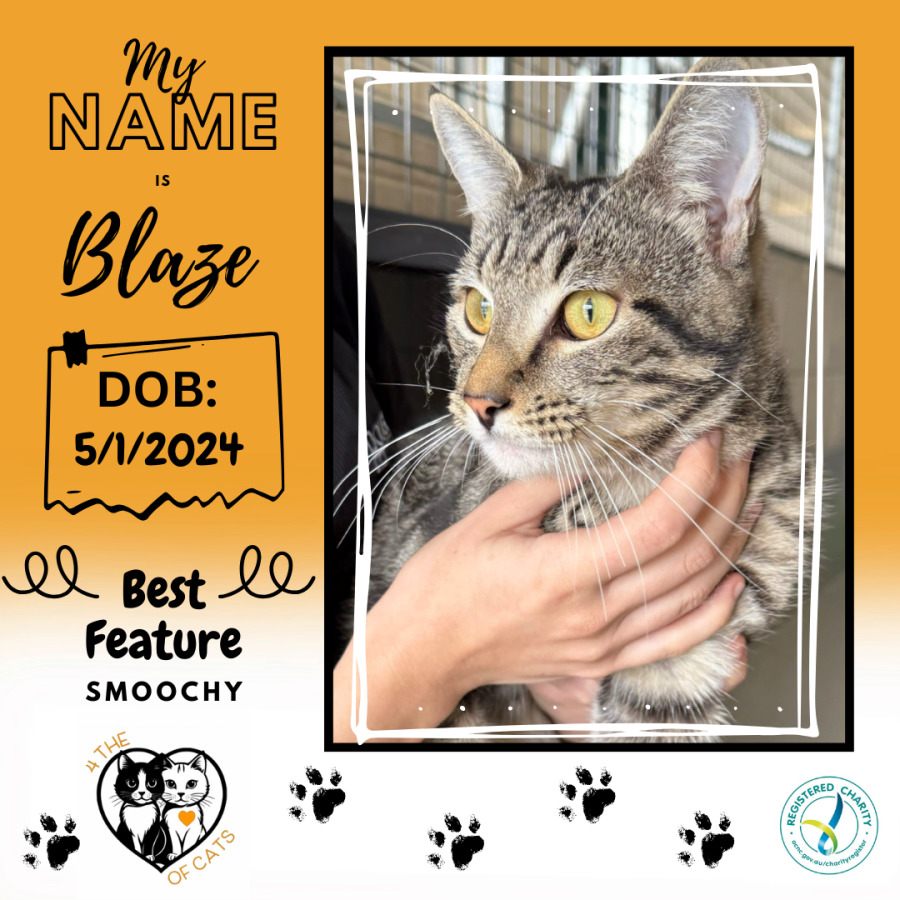 Blaze is a happy cat that loves nothing more than a good pat. He has striking tabby markings that travel all the way to the end of his tail and glowing yellow eyes.