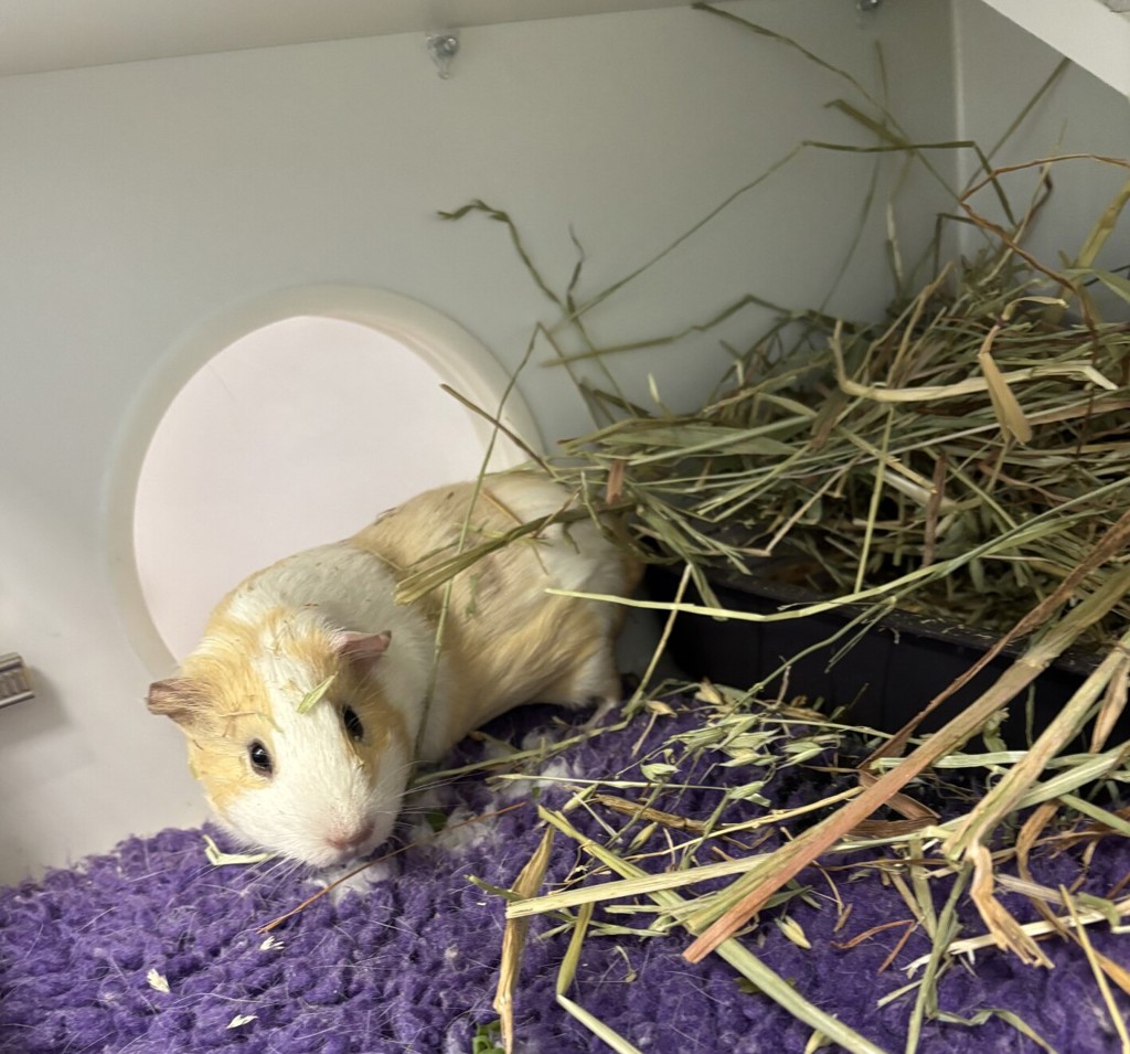 Sandy is an adorable 8-month-old smooth-haired guinea pig with a soft blonde and white coat that perfectly matches her name. She displays all the classic guinea pig traits-curious, social, and full of gentle squeaks, especially when she hears the rustle of a veggie bag! Sandy enjoys exploring her surroundings, relaxing in cozy hideouts, and spending time with people. With her sweet nature and charming personality, she'd make a wonderful companion for anyone looking to add a little furry friend to their life. 🐹