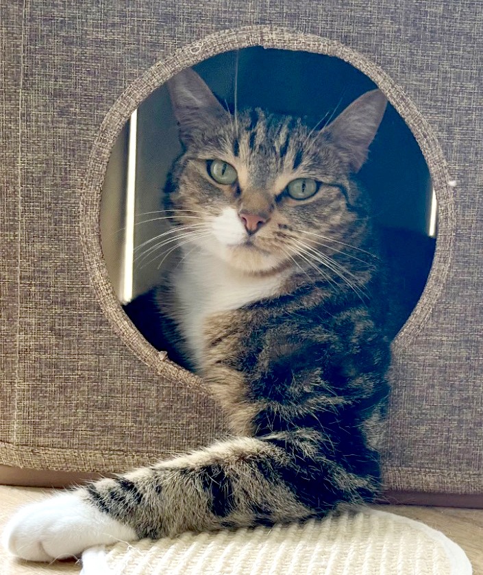 Woody is a 4-year-old short-haired tabby with distinctive swirled markings and cute white socks. He’s curious and independent, often found lounging near a window watching the world go by or listening to the birds. While not a fan of being picked up, Woody is a gentle soul who enjoys the occasional pat and will reward you with chirpy little replies when you call his name. He’s got a playful streak too and enjoys zoomies and wrestling sessions with his brother when the mood strikes.