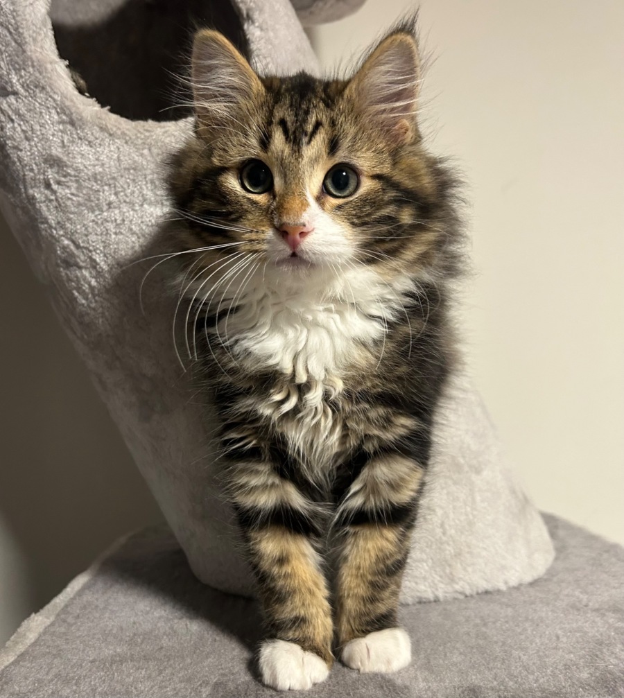 He is social with other cats and must go to a home with an existing cat or be adopted with another little kitten! Kittens do much better with a little friend.