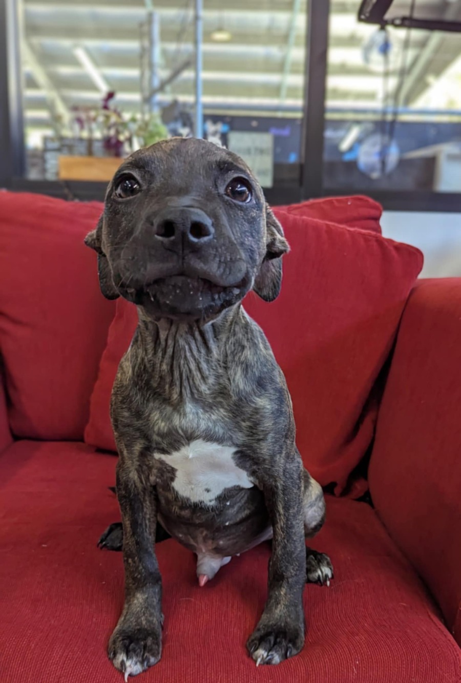 Augie's mum & her two sisters were all impregnated on the same day by the same male dog. All 3 mums are microchipped as American Staffy, however their head heights are all below the knee, so they are quite small for the breed. We believe dad is also a Staffy x. All puppies from these litters have been surrendered for rehoming & we have desexing appointments booked for the mums to ensure there's no more accidental litters.