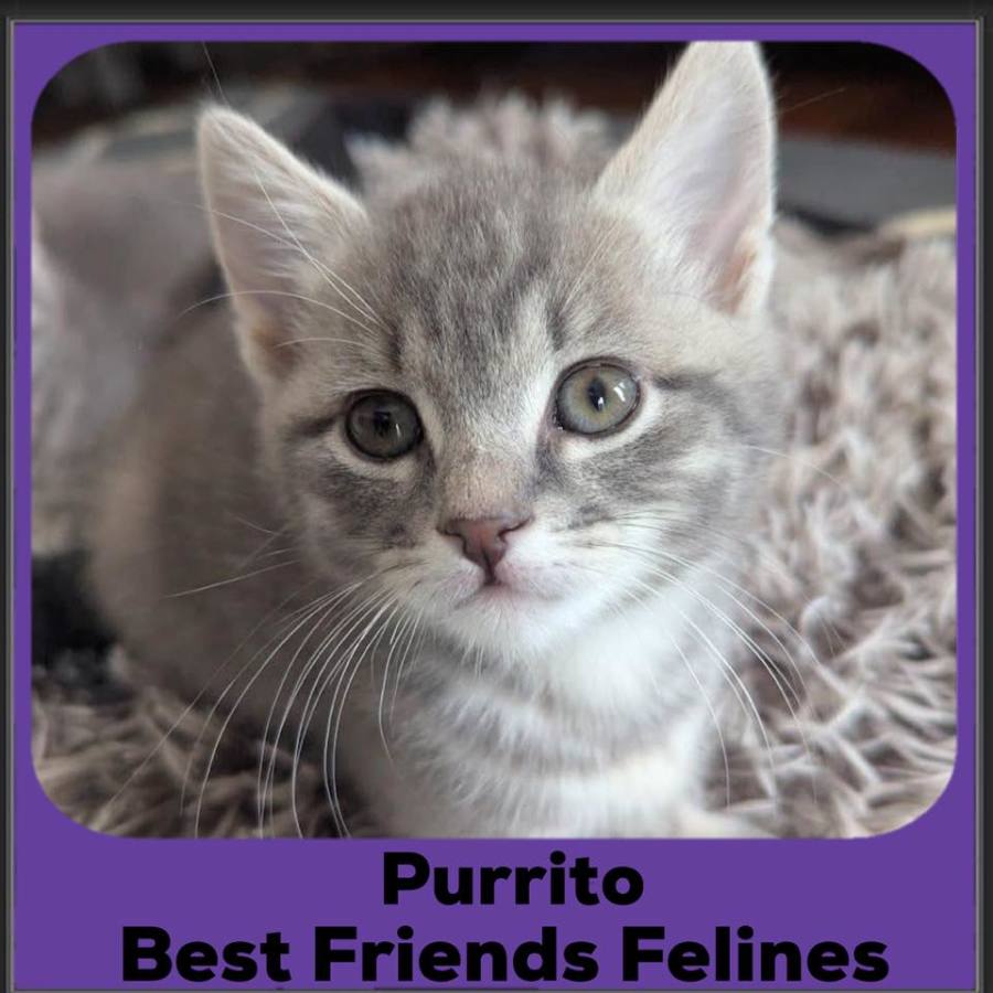 She may have a name that sounds like a snack, but Purrito is all heart and no crunch. With her soft grey tabby stripes, long elegant whiskers, and permanently serene vibe, she’s the kind of kitten who prefers naps over nonsense.