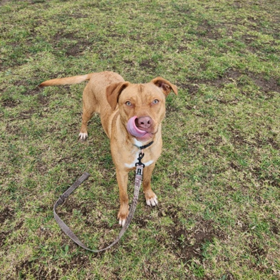 Quinn is a fun loving bouncy staffy mix who arrived at GAWS as a stray. She potentially is mixed with a larger breed as she is already 28kg. Quinn has arrived with enthusiasm and energy. She has always been good to handle (wiggly if anything), not too bad to walk on lead and is very dog social. Quinn has made some nice dog friends and enjoys social group however she does lack some introduction and play boundaries so needs guidance when socializing. She can sit and drop, but not much else is known of her history. She has not yet been tested with cats, and if children are involved, it's recommended they are over 10 years due her energy and size. Quinn is a loving, friendly dog looking for an active owner to engage training and embrace her into their lives.