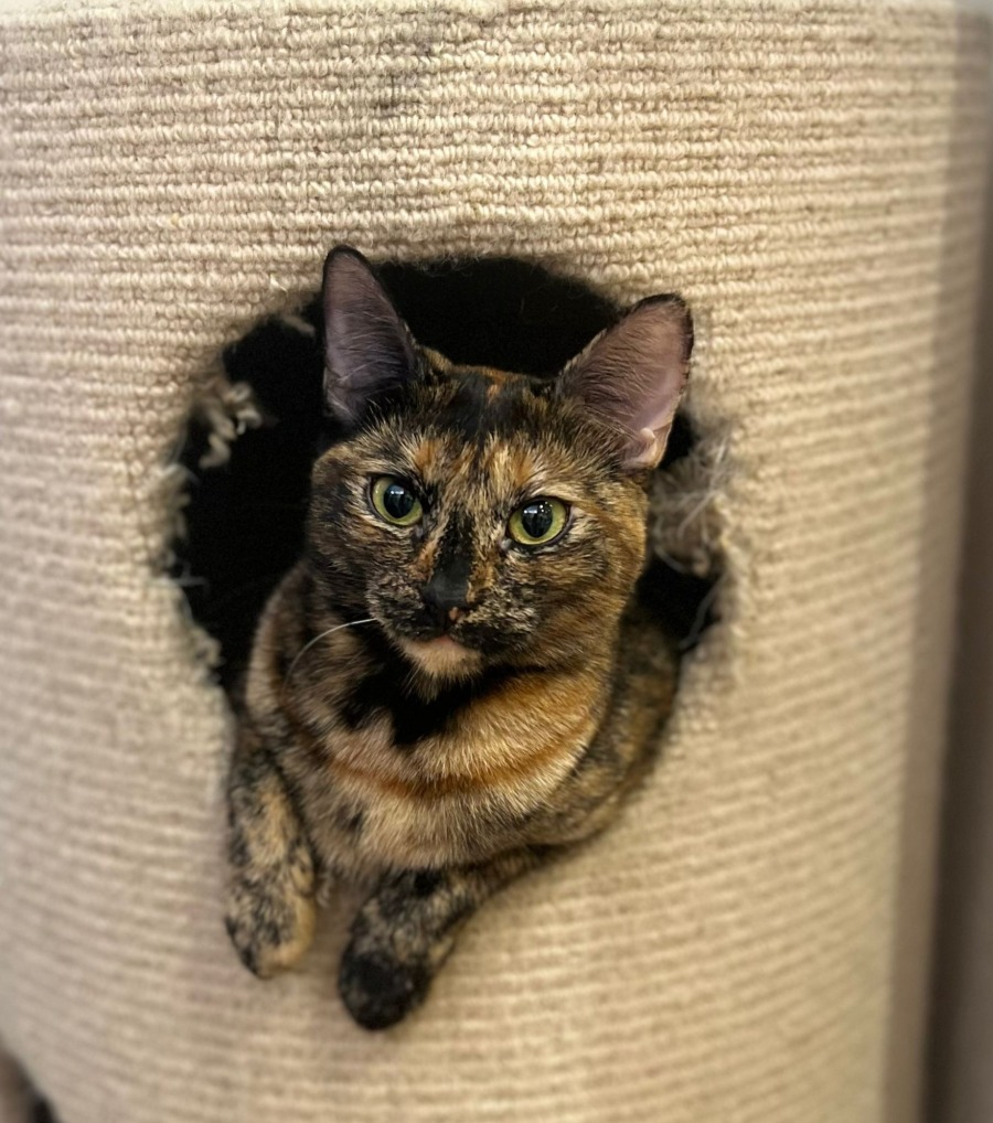 Precious is a short-haired Tortie. She’s gentle and sweet natured. She doesn’t mind being picked up and cuddled occasionally. She won’t sit on your lap, but likes being around people.