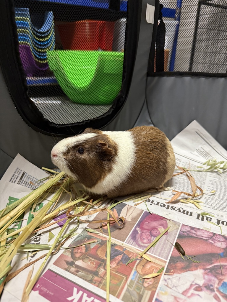 Hey everybody, I am Boorloo! I am a cool piggy looking for a warm hutch to make my home. I can be a little wriggly at first but give me some time and gentle handling and we will have cuddles in no time. I will need a place to be kept warm in winter, and cool in summer, and always have access to fresh water. I will need pellets for breakfast, a handful of greens as a treat (spinach, kale, Asian greens) and small bits of fruit (apple, pear, banana) and hay all day every day. If you like the look of me, come down today!