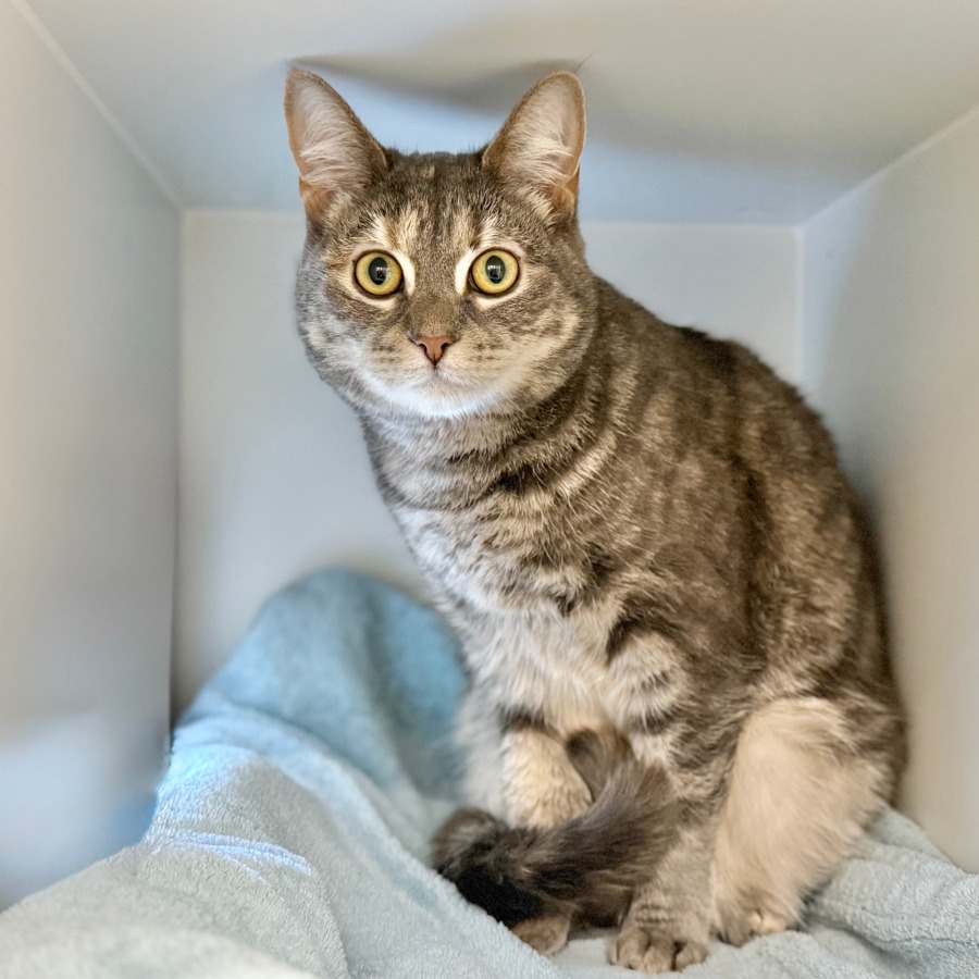 Winnie would prefer a household with adults only, as little ones can be a bit overwhelming for her. Once she feels settled, she enjoys gentle company and will happily share your space with quiet affection.