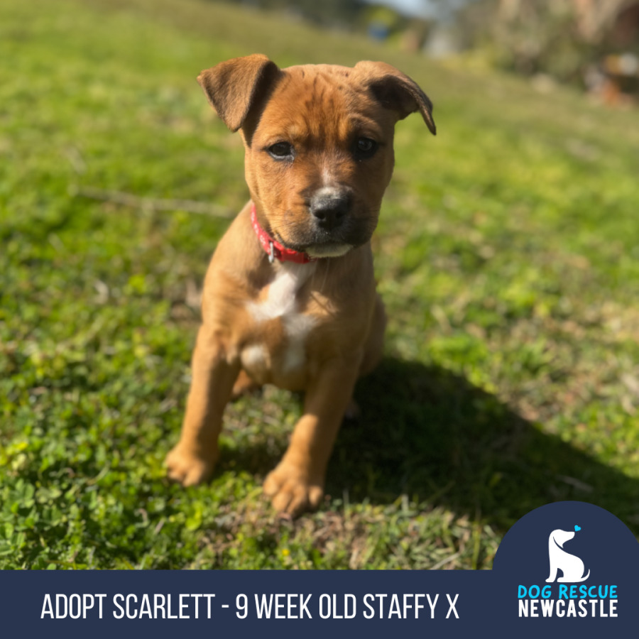 Named after the fierce and fabulous Scarlett from the Marvel universe, this 9-week-old Staffy X is ready to be the heroine of your heart. With a spark in her eye and the sass to match, Scarlett is a confident little pup who’s destined for greatness (and a lifetime of cuddles). 💫