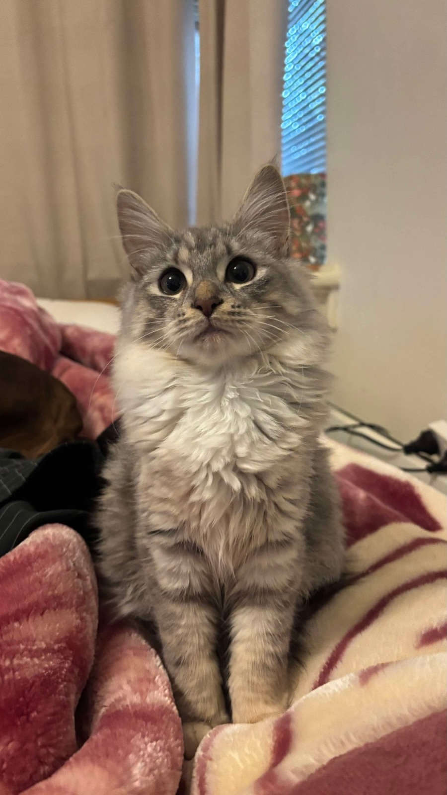 Momo is a beautiful, fluffy and grey sweet-heart who is stunningly gorgeous and sure to grow into a magnificent cat.