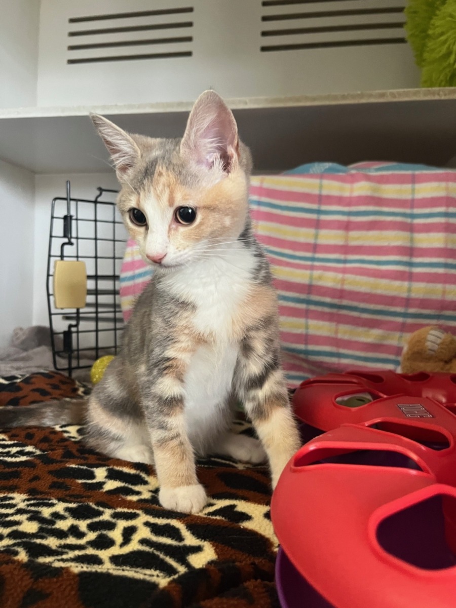 This gorgeous little calico girl is the perfect mix of fun and chill. Twisties is playful, extremely friendly, and absolutely adores being patted. She’ll zoom around chasing toys one minute, then curl up like a little loaf the next, happily watching the world go by.