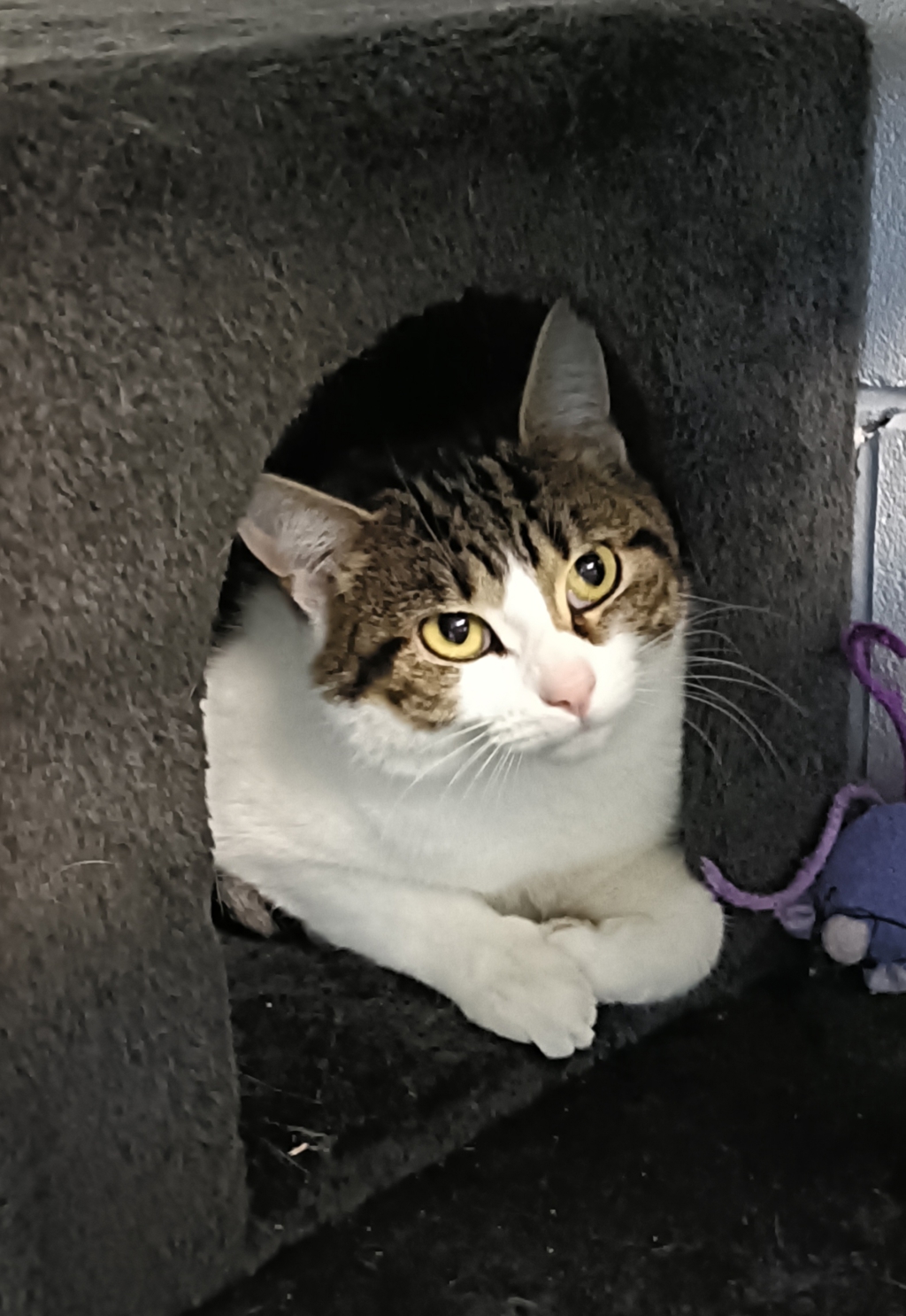 Lovely Immy is a quiet soul with a soft tabby-and-white coat and a heart full of love just waiting to be shared. She came into our care as a young kitten, rescued by our Inspectors, and has spent much of her young life patiently waiting for a home of her own.