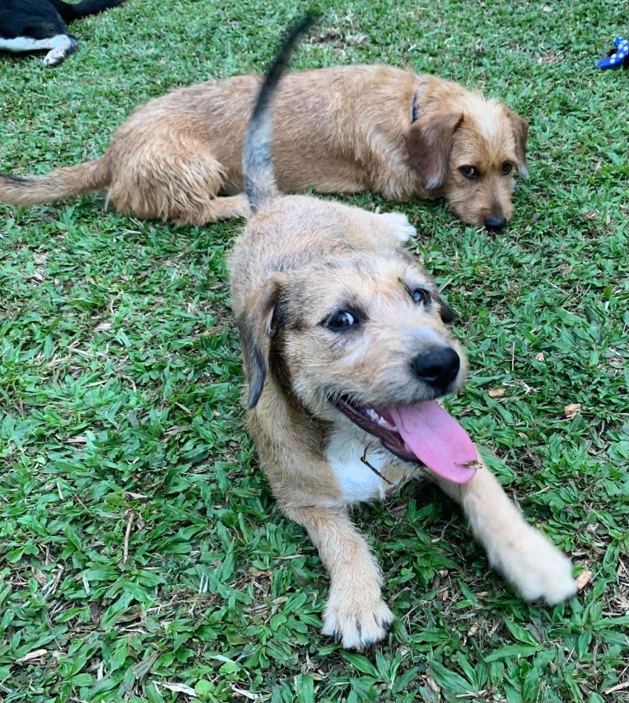 Sheba (dark pink collar) was born on 01/02/25 old and weighs about 11 kilograms. Sheba is slightly taller than Maurice but is not as long; she has more of the Terrier features. As she is still in the puppy stage, Sheba is adventurous and will initiate play with Maurice or other dogs; she loves playing, learning new skills and having new experiences.