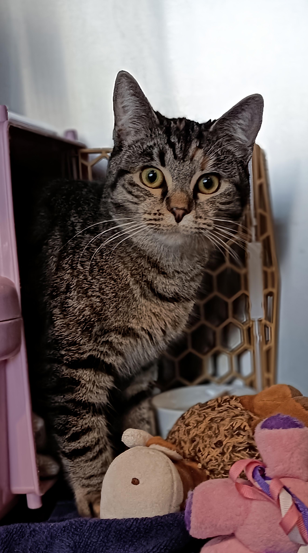 Introducing Brandy, a beautiful 7-month-old tabby torti with a heart as soft as her fur. She may be a little shy when you first meet her, but with a bit of patience and kindness, she blossoms into a sweet and playful companion.