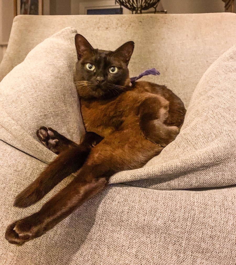 Suki is an all-access cuddle bug. With familiar faces, she’s utterly smitten—curling up, offering shoulder rides, and delivering the occasional lick of affection. And when new people come around? She’s just as friendly, often greeting passers-by with an invitation for belly rubs and snuggles. She’s equal parts elegant and endearing, often spotted striking a pose in the window or scaling the highest perch she can find.