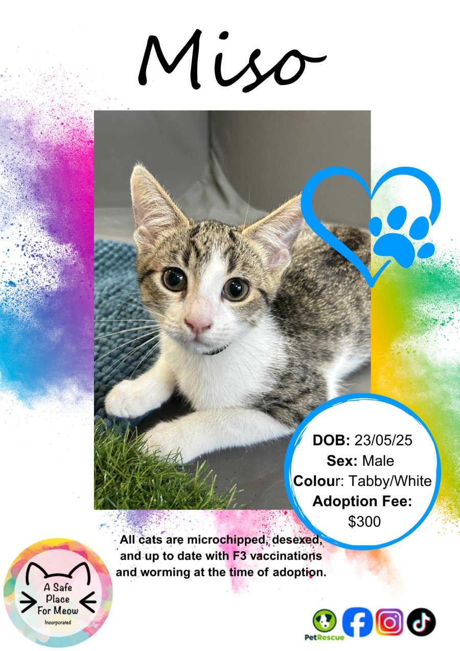 With an equal blend of cheekiness and cuddles, Miso is always up for a bit of fun, inviting you into a world of playful antics. This delightful mix makes Miso an engaging companion who'll bring joy and a few laughs to your day.