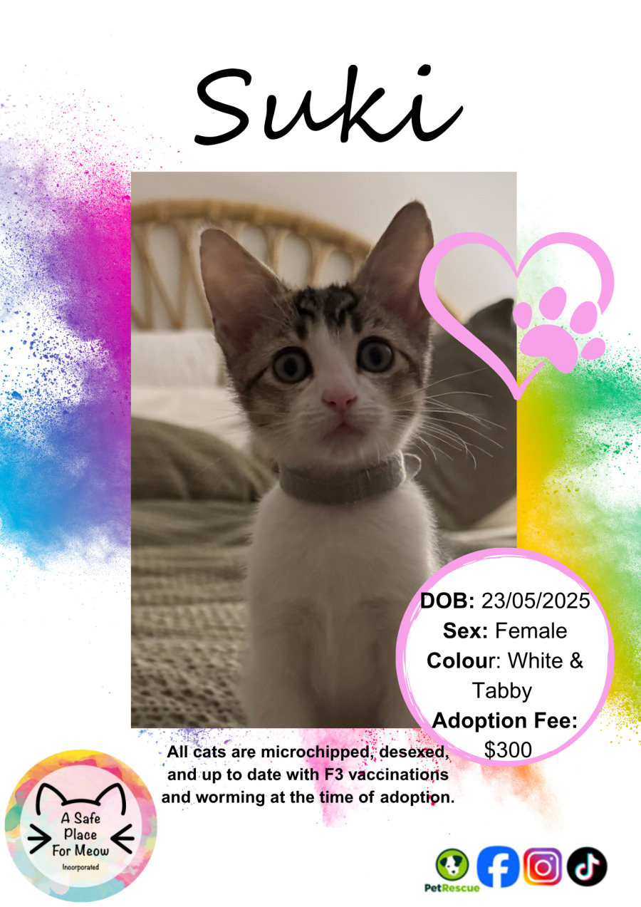 Meet Suki, the sweetest little girl who's ready to snuggle her way into your heart. This affectionate feline is known for her smoochy nature and obsession with being close to her human companions. Whether she's curling up on your chest or perched on your shoulder, Suki ensures your heart and home are full of warmth and love.