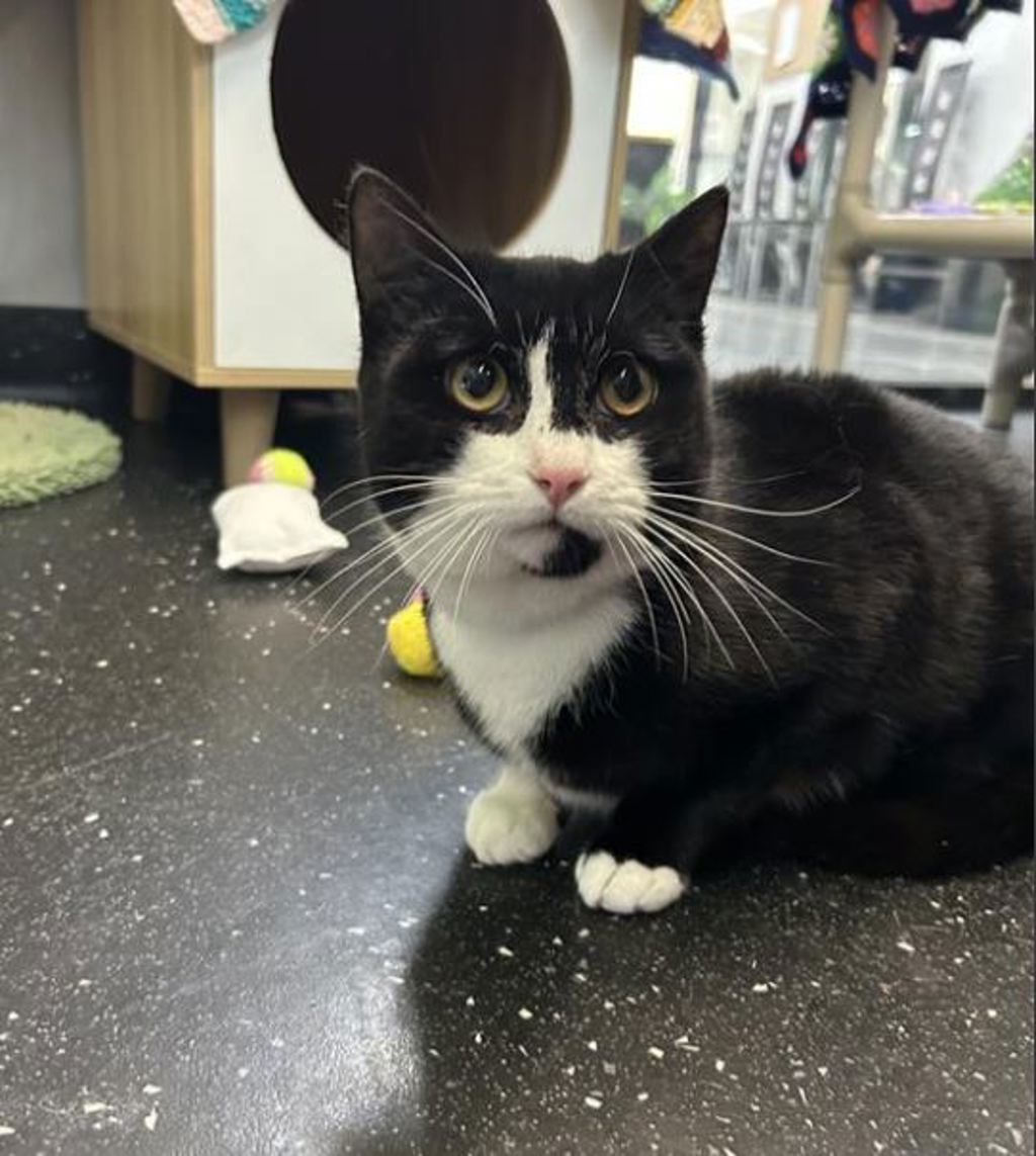 Augie is a striking black and white gentleman with a heart full of affection and just the right dash of mischief. At 1 year and 7 months old, he's hit that perfect stage between playful kitten and laid-back adult. Whether he's chasing a toy mouse or curling up in a sunny spot for a nap, Augie brings warmth and personality into every room he enters.