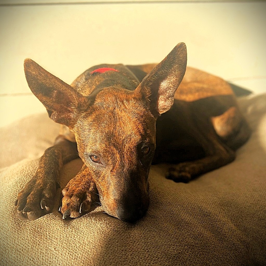 Heâs friendly with new people, loves cuddles, and has a great balance of being by your side while also happily relaxing on his own in a sunny spot. Merlin lives peacefully with other dogs and would love a canine friend to learn from or play with. Heâs growing in confidence every day and will make a loyal, loving addition to the right family.