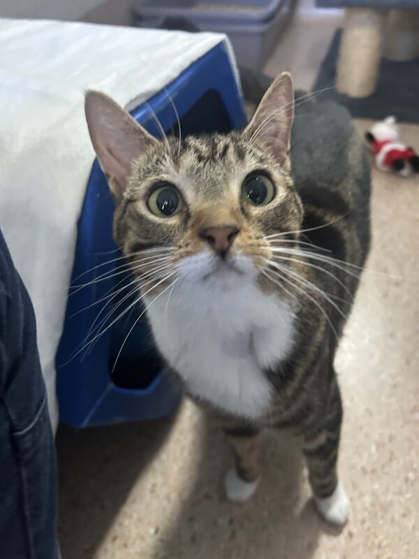 Meow there, my name is Miu Miu. I didnt have the easiest start to life, and am now on the lookout for my new furever home and live my purrrrfect happily ever after. I am happy little lady, being the perfect combination of both playful and sweet who loves the company of my human friends. However, my true personality will develop as I grow up in my new home. I would absolutely love a home where I can curl up in your laps, and receive all the lobe in the world! Also a comfy bed or cubby in a nice safe spot to relax would just be the best! Finally, if you have a place in your heart and home with everlasting love to give. Then please come into the shelter to meet me today! I will be waiting xx
