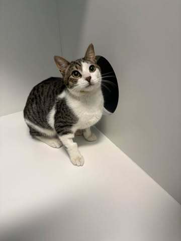 I'm a super cute, male Domestic Short Hair kitten, just a little over 9 months old. I'm a growing ball of love, I promise to bring endless joy and laughter into your life. I'm a little shy at first but I'm a playful explorer who loves to scamper around and chase after toys. I have a big heart that's ready to shower you with purrs and cuddles. I'm quite the social butterfly and I get along with other pets too! I'm curious about the world and eager to learn new tricks and manners.