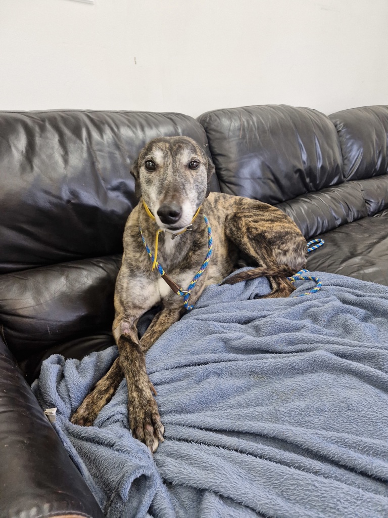 With every gentle stride, Tess shows the poise of a seasoned racer and the calm of a dog who's learned to savor the slower pace of retirement. She's mastered the art of the couch cuddle, the soulful gaze, and the perfect power nap. Dog social with all sized canines, Tess is one dog that with slow intro's may also be able to live with cats.