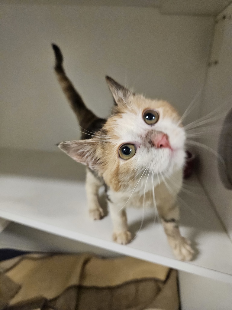 Hi, my name is Cabbage, I'm a friendly, confident little kitten looking for my forever home. The world also looks a little topsy-turvy for me as I have a head tilt - please ask the staff about it when you come to see me. If you think I'm the one for you, come to the RSPCA in Malaga to meet me today!