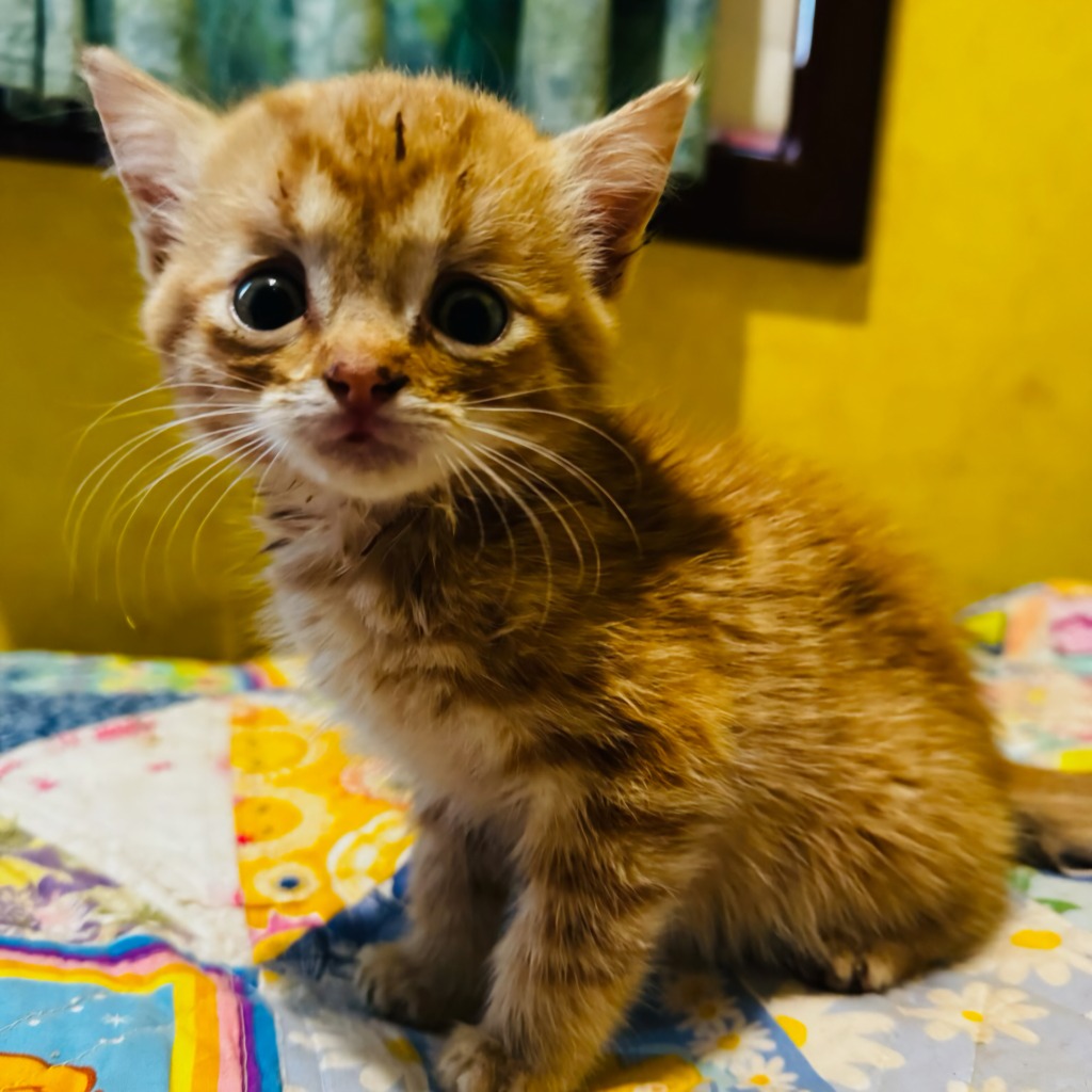 Broskie-Tee isn’t just any kitten — he’s a one-in-a-million discovery. This ginger boy with glowing aquamarine eyes was found out in the middle of nowhere, far from any homes. A true blue rescue, he was surviving alone under open sky, and somehow came through it all with a gentle heart and a quiet spirit.