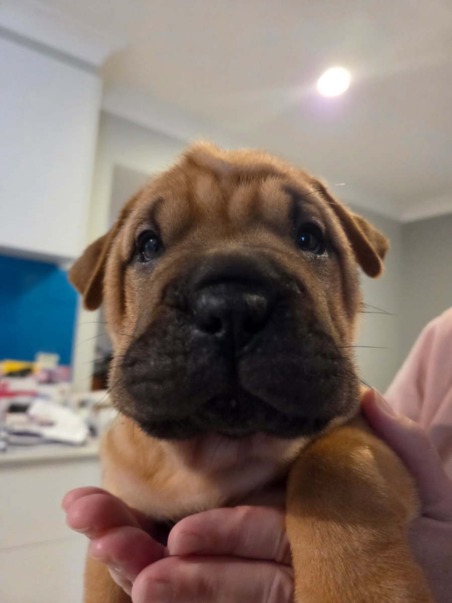 We expect Zuckerman will be large in size when fully grown. From what we know, Mum was a Shar Pei (possibly cross), and Dad is unknown — but judging by how quickly these pups are growing, We estimate the dad was a large breed dog.
