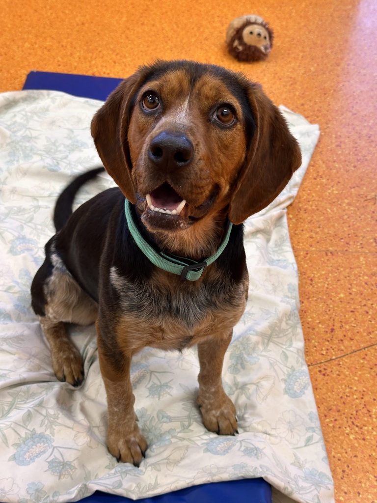 Meet Dobby, a young playful girl looking for her forever home! True to her breed Dobby LOVES to sniff. She is easily distracted by scents and objects around her. She will likely need some time to fully explore her environment before she is ready to interact and play. Dobby loves her treats and using snuffle mats to search for her food. We would highly recommend feeding all meals from food based enrichment to keep her mind busy. Dobby would love to be allowed indoors to be part of the family - she can be a little jumpy at times and will thrive with continued training in the home. Dobby must meet other dogs at time of adoption. She can be a little unsure and submissive when first meeting but with a little time she softens.