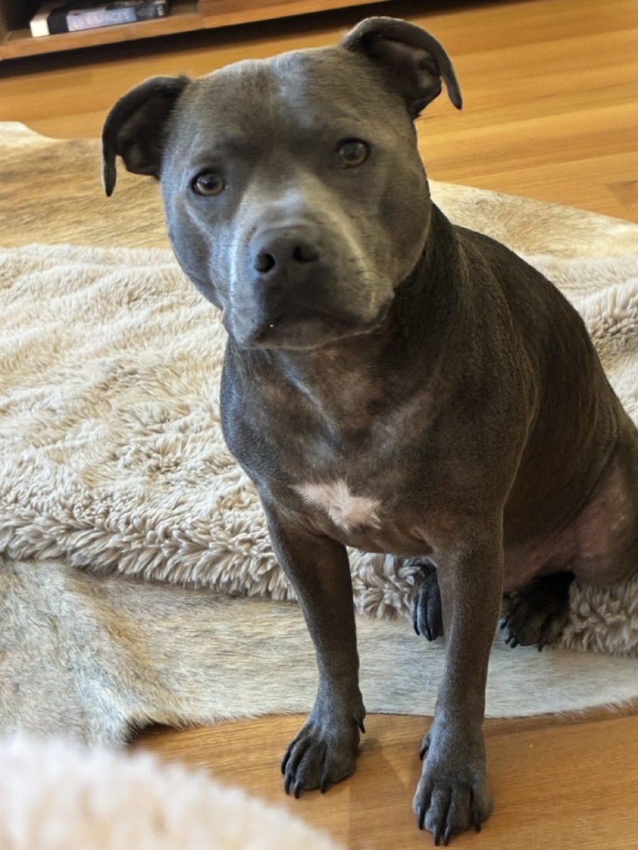 I’m a confident, social, and delightfully needy English blue Staffy who lives for human attention. Cuddles, belly rubs, and being the centre of attention? Yes please!!