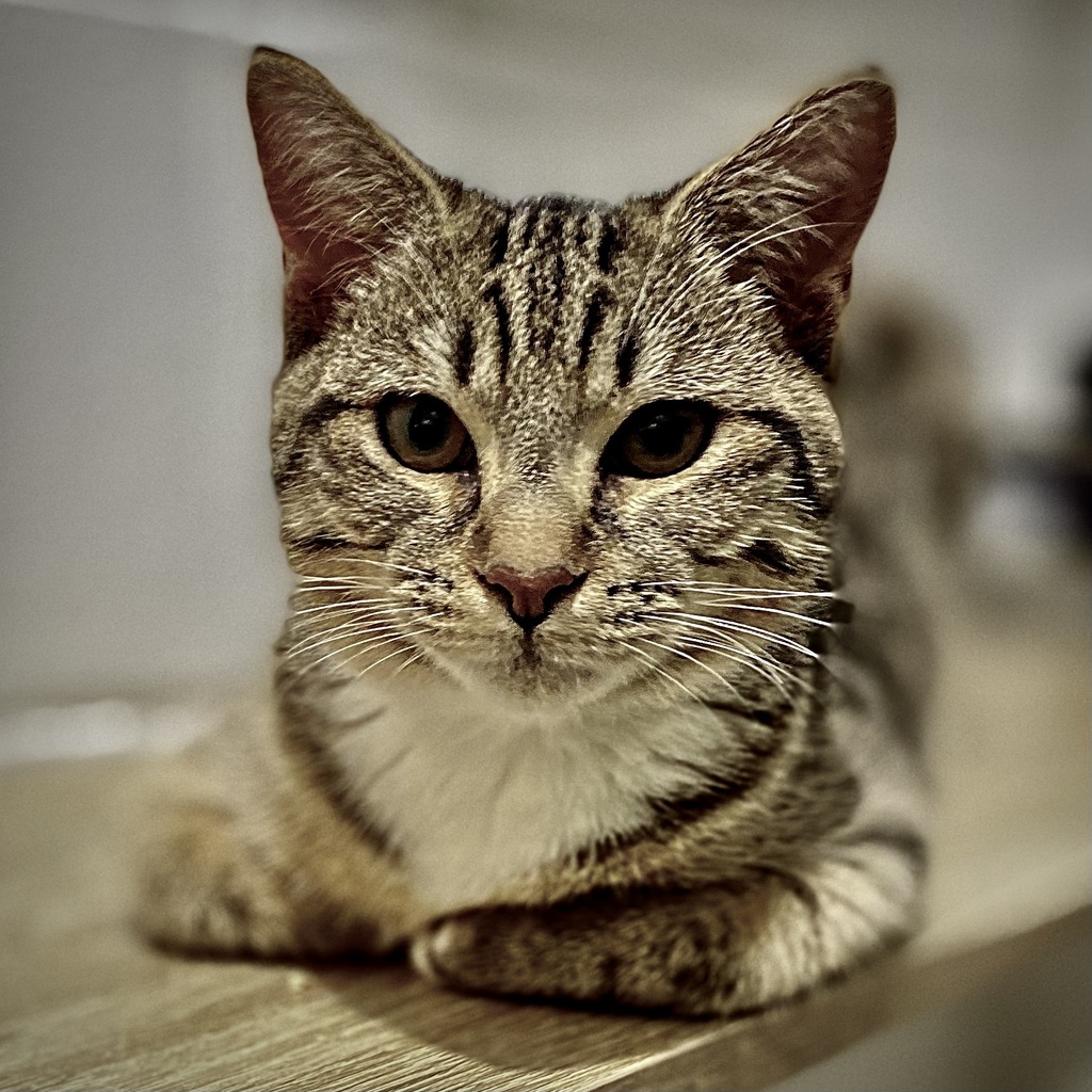 ** I have big, beautiful eyes and a thick, soft brown-tabby coat. FYI, my eyes are very sharp at seeing you opening food packets as I'm an excellent eater. What my eyes miss, my ears never fail to pick up.
