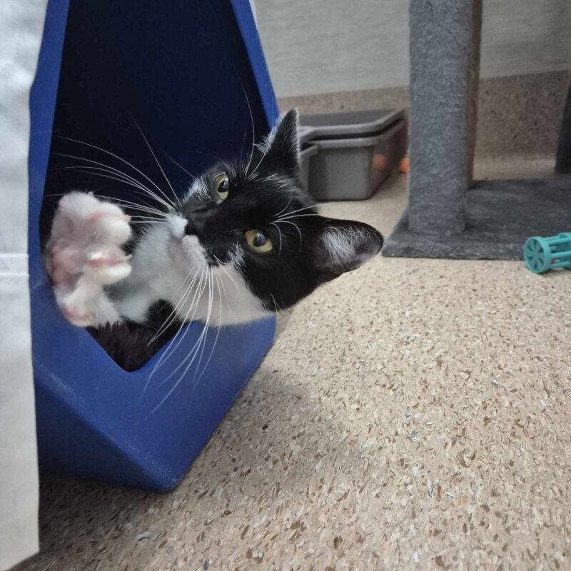 I'm an affectionate girl with a soft black-and-white coat and an even softer heart. At just 2 years old, I'm the perfect mix of youthful curiosity and calm maturity.